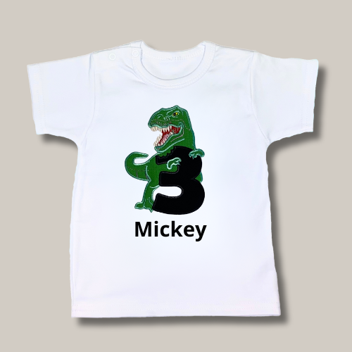 Op zoek naar een uniek verjaardagsshirt voor een jongen? Dit geborduurde T-shirt met een stoere dinosaurus applique, de leeftijd en naam van de jarige is perfect voor een dinofeestje! Gemaakt van zacht katoen voor comfort en stijl. Bestel nu voor een onvergetelijke verjaardag!