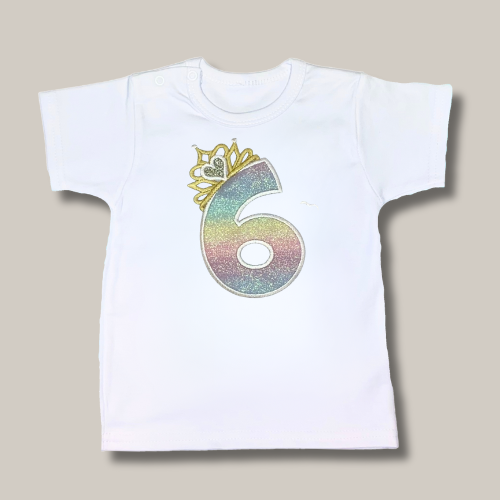 Vier de 6e verjaardag van jouw kleine prinses in stijl met dit geborduurde meisjes T-shirt! Dit unieke verjaardagsshirt is voorzien van een prachtige prinses applique, het cijfer 6 en (optioneel) de naam van de jarige. Een perfecte outfit voor een sprookjesachtig verjaardagsfeestje!