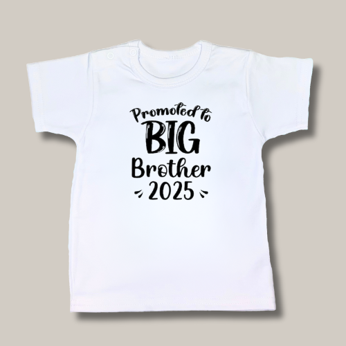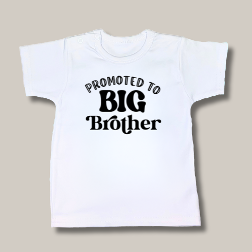 Maak de komst van een broertje of zusje extra speciaal met dit “Promoted to BIG Brother ” T-shirt! Perfect voor trotse grote broers in spé.